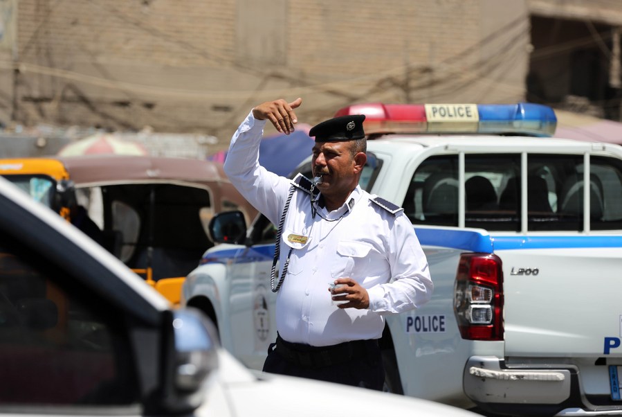 A traffic policeman works amid a heatwave in a square in Baghdad, Iraq, July 18, 2023. (Xinhua/Khalil Dawood)