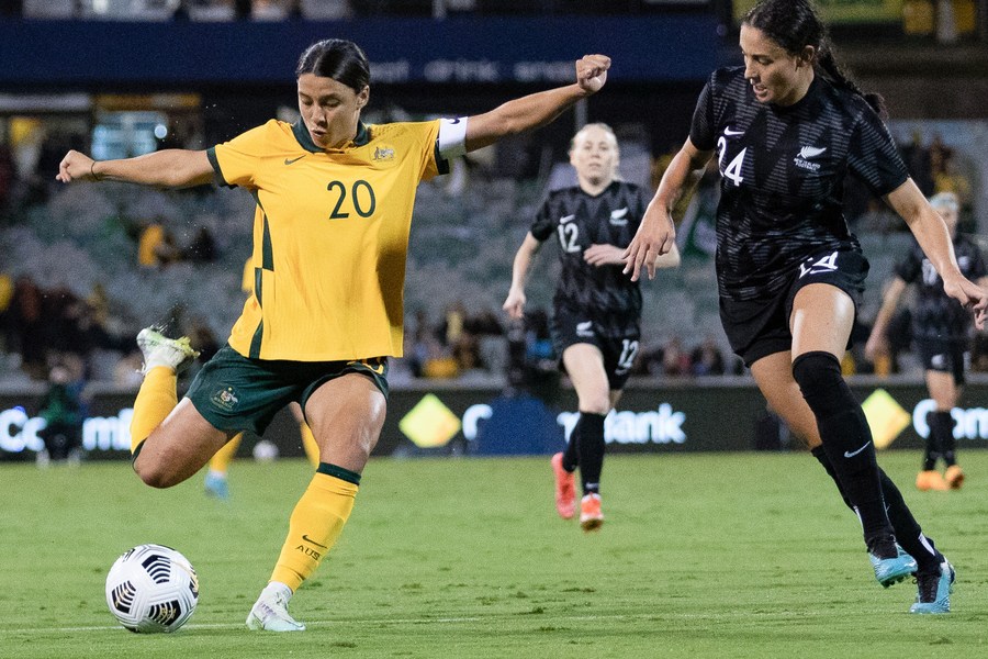 Australia's Sam Kerr goes for goal during a friendly against New Zealand in Canberra, Australia on April 12, 2022. (Photo by Chu Chen/Xinhua)