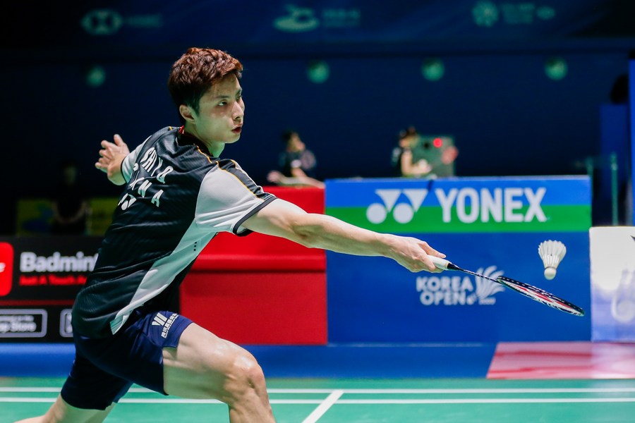 Shi Yuqi of China competes in the men's singles 2nd round against Kento Momota of Japan at the BWF Korea Open Badminton Championships 2023 in Yeosu, South Korea, July 20, 2023. (Xinhua/Wang Yiliang)
