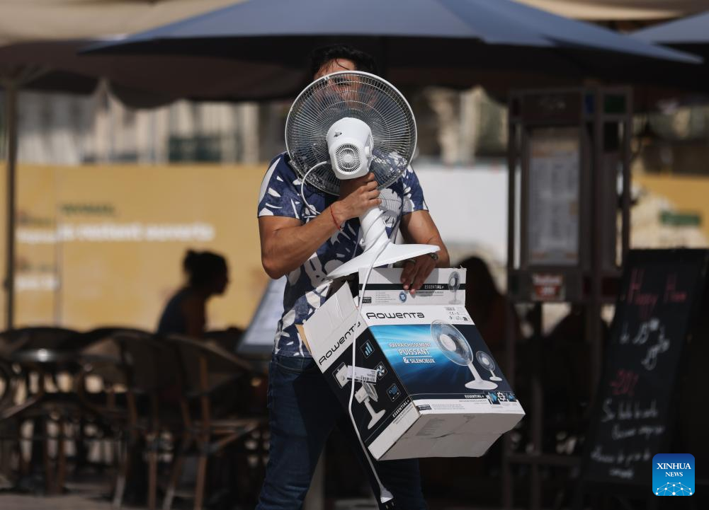 A man carries a fan while walking on the Place de Comedie as the highest temperature reaches 38 degrees centigrade in Montpellier, southern France, July 19, 2023. Extreme heat warnings were issued across Europe on Wednesday as the best part of the continent was gripped by the most intense heatwave since records began. (Xinhua/Gao Jing)
