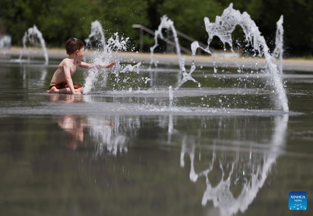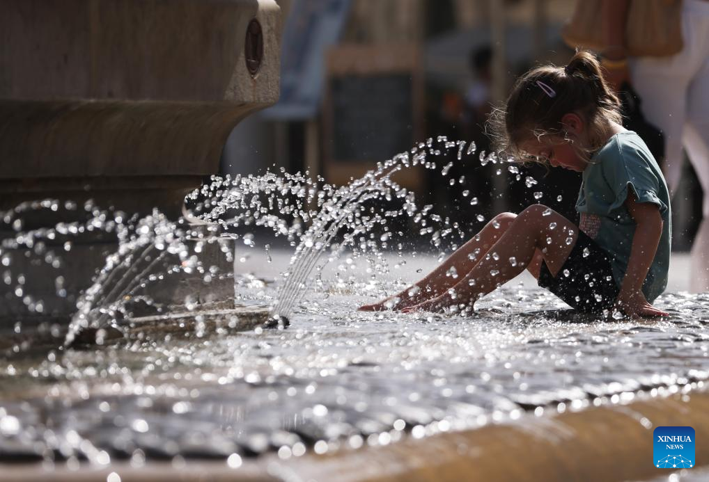 A boy cools himself at a fountain in Montpellier, southern France, July 18, 2023. Extreme heat warnings were issued across Europe on Wednesday as the best part of the continent was gripped by the most intense heatwave since records began. (Xinhua/Gao Jing)