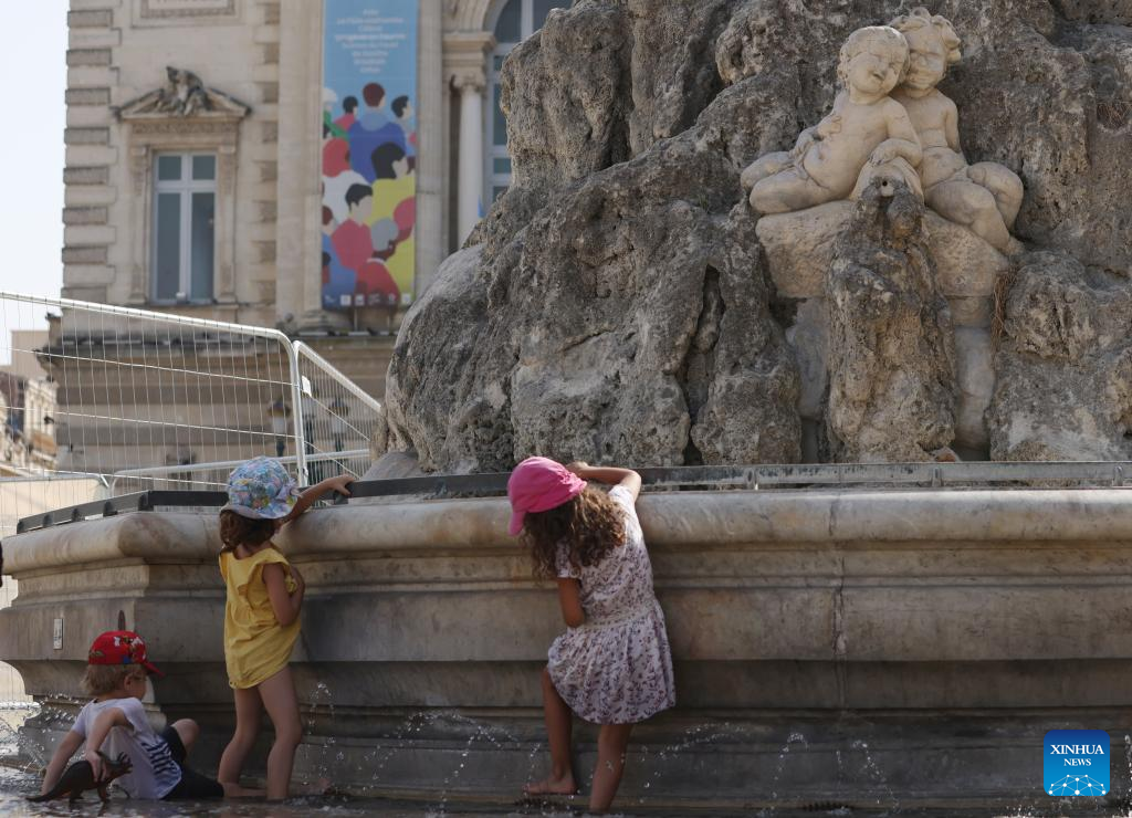 Children cool themselves at a fountain of Three Graces on the Place de Comedie as the highest temperature reaches 38 degrees centigrade in Montpellier, southern France, July 19, 2023. Extreme heat warnings were issued across Europe on Wednesday as the best part of the continent was gripped by the most intense heatwave since records began. (Xinhua/Gao Jing)