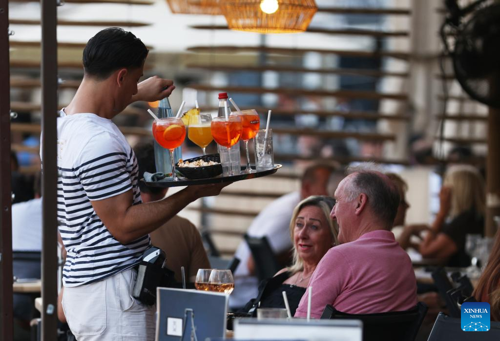 A waiter serves iced drinks at a bar in Montpellier, southern France, July 18, 2023. Extreme heat warnings were issued across Europe on Wednesday as the best part of the continent was gripped by the most intense heatwave since records began. (Xinhua/Gao Jing)