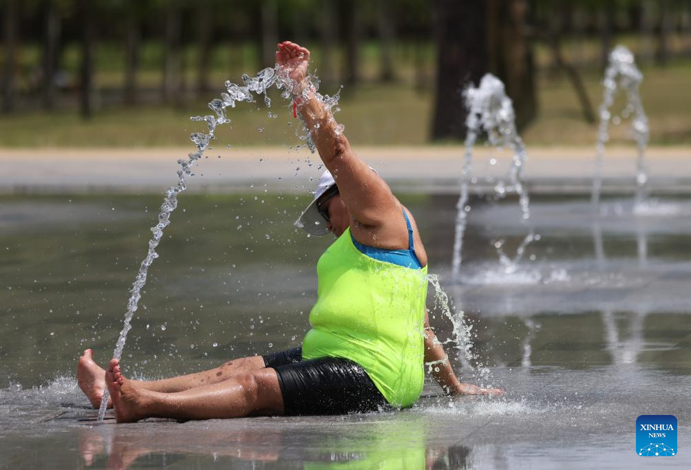 A woman cools herself at a fountain in Montpellier, southern France, July 18, 2023. Extreme heat warnings were issued across Europe on Wednesday as the best part of the continent was gripped by the most intense heatwave since records began. (Xinhua/Gao Jing)
