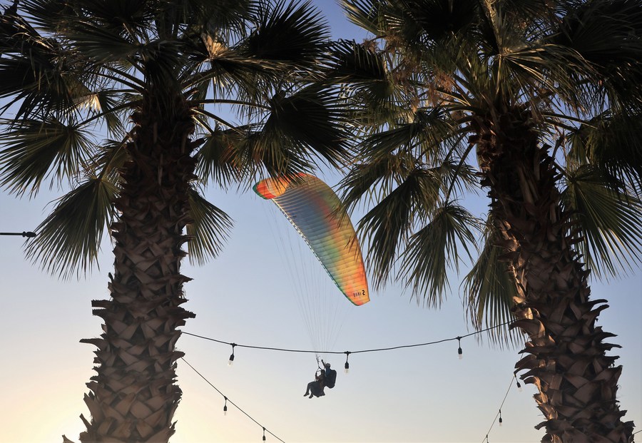 Paragliders are landing at the seaside of Jounieh Bay near Beirut, Lebanon, on July 15, 2023. (Xinhua/Liu Zongya)