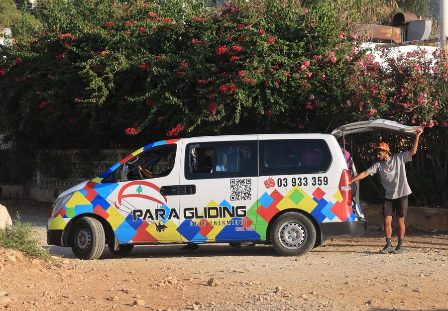 A minibus is taking paragliders to the take-off point on the top of the mountain besides Jounieh Bay near Beirut, Lebanon, on July 15, 2023. (Xinhua/Liu Zongya)