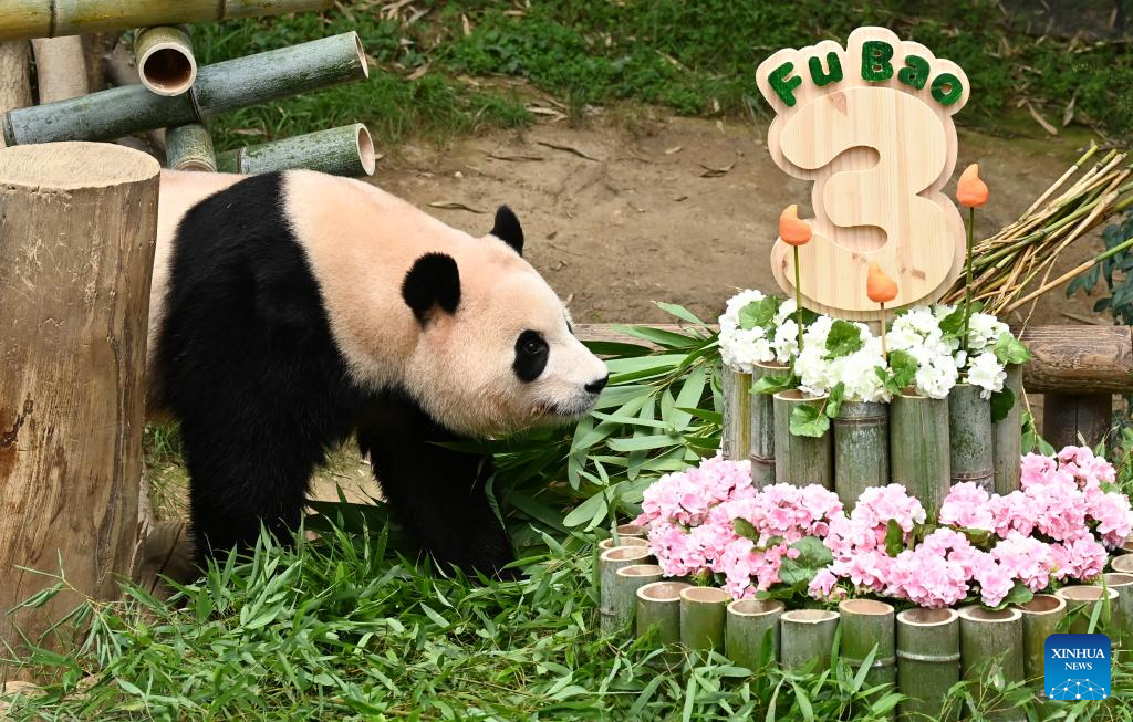 Giant panda Fu Bao eats bamboo at Everland Resort in Yongin, South Korea, July 20, 2023. The giant panda Fu Bao celebrated its 3rd birthday on Thursday. (NEWSIS via Xinhua)