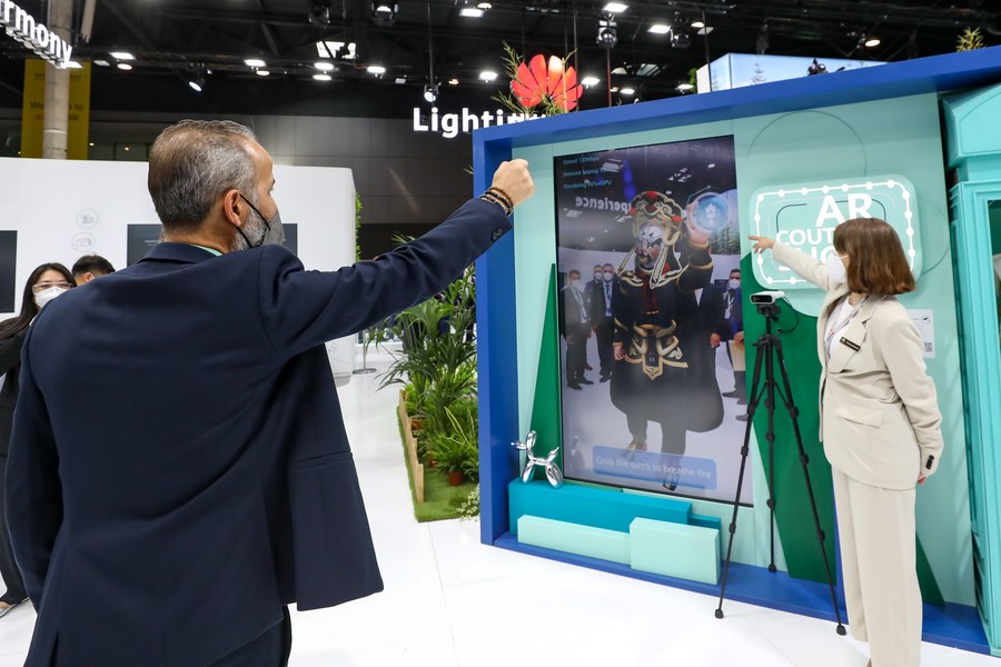 A visitor tries an AR game at the booth of Chinese tech company Huawei during the Mobile World Congress (MWC) at the Barcelona FIRA Gran Via exhibition center in Barcelona, Spain, June 28, 2021. (Xinhua/Zhang Cheng)