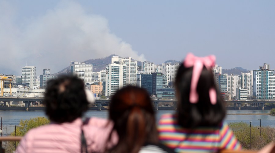 People look out for a forest fire on Mount Inwang in Seoul, South Korea, April 2, 2023. (NEWSIS via Xinhua)