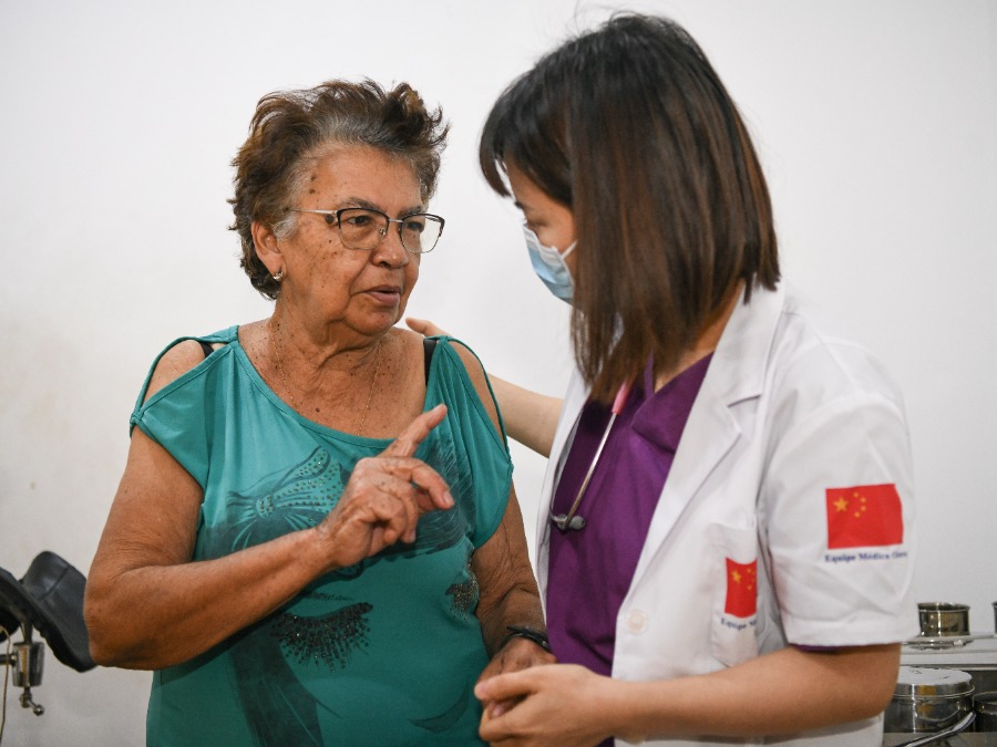 Luo Xingyu (R), an obstetrician-gynecologist of the Chinese medical team, talks with a patient at a clinic in Sao Tome, Sao Tome and Principe, on July 14, 2023. (Xinhua/Han Xu)