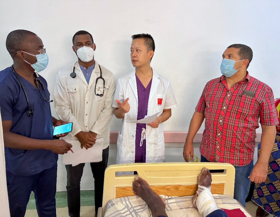 Zhang Ming (2nd R), head of the Chinese medical team, checks on a patient with local doctors at Hospital Ayres de Menezes in Sao Tome, Sao Tome and Principe, July 17, 2023. (Chinese medical team to Sao Tome and Principe/Handout via Xinhua)