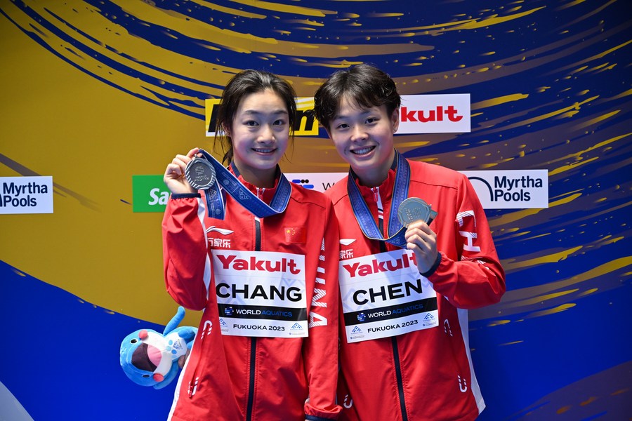 Gold medalist Chen Yiwen(R) of China, silver medalist Chang Yani of China pose during the awarding ceremony of the women's 3m springboard final of World Aquatics Championships 2023 held in Fukuoka, Japan, on July 21, 2023. (Xinhua/Zhang Xiaoyu)