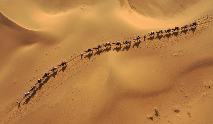 This aerial photo taken on July 20, 2023 shows visitors riding camels at the Shapotou scenic spot in Zhongwei, northwest China's Ningxia Hui Autonomous Region. Shapotou scenic spot has entered its peak tourism season during the summer vacation, with the largest daily visitor flow reaching over 10,000. (Xinhua/Wang Peng)