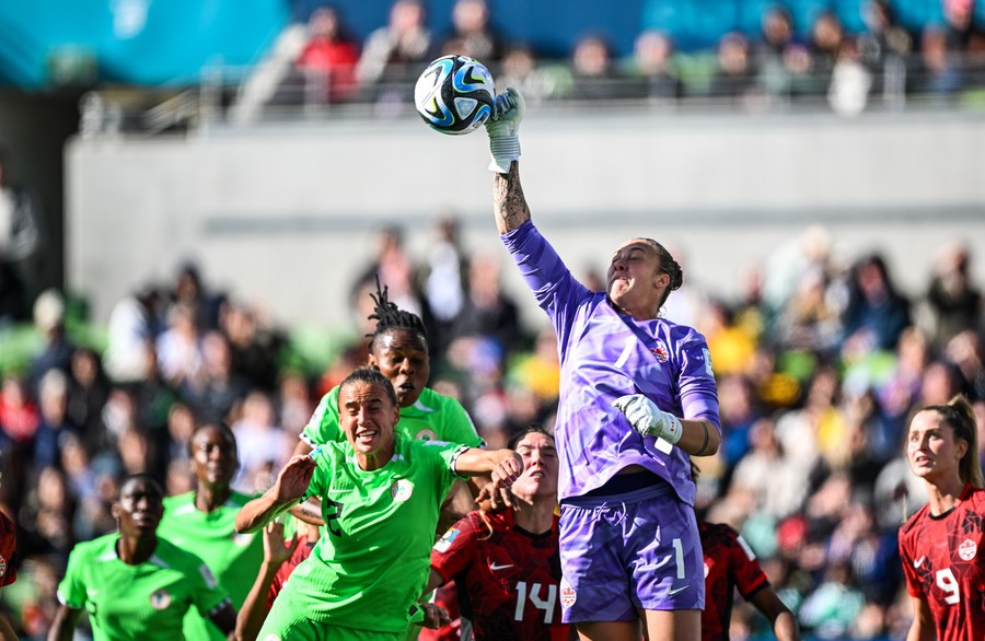 Kailen Sheridan (top) of Canada saves the ball during the Group B match between Canada and Nigeria at 2023 FIFA Women's World Cup in Melbourne, Australia, July 21, 2023. (Xinhua/Mao Siqian)