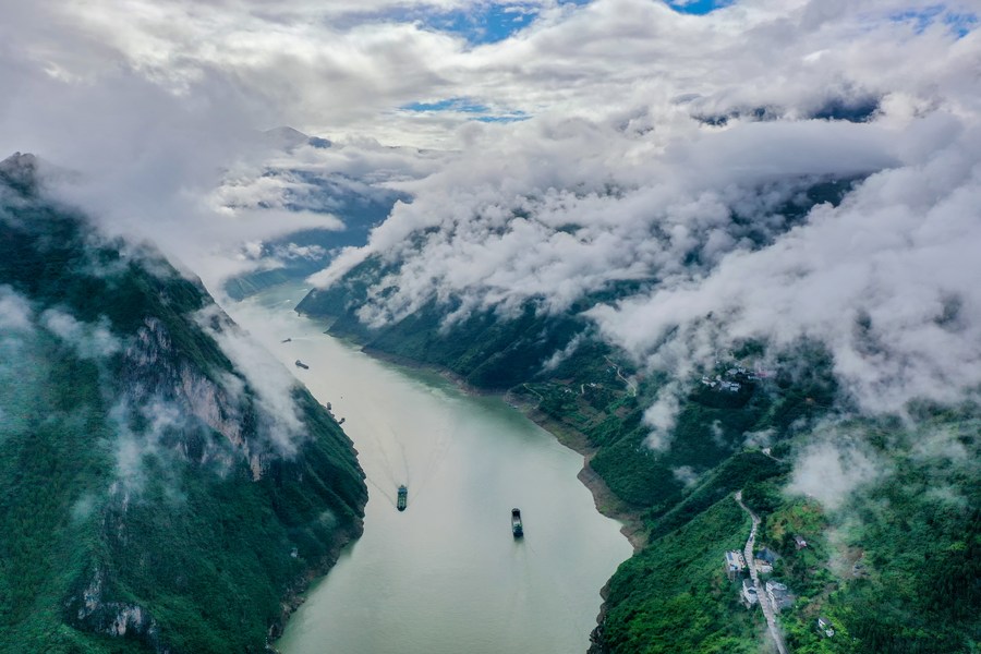 This aerial photo taken on June 30, 2023 shows the scenery of Wuxia Gorge, one of the Three Gorges on the Yangtze River, in southwest China's Chongqing Municipality. Located in the upper reaches of the Yangtze River, the Three Gorges Reservoir area is an important ecological function zone and reservoir of freshwater resources in China. The Three Gorges -- Qutang, Wuxia and Xiling gorges -- features precipitous cliffs, famous scenic spots and historical sites. (Xinhua/Huang Wei)