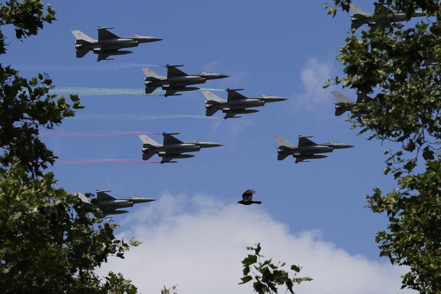 F-16 aircraft fly during a military and citizens' parade of Belgian National Day celebrations in Brussels, Belgium, on July 21, 2023. (Xinhua/Zheng Huansong)