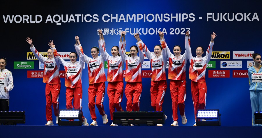 Team China poses on the podium during the awarding ceremony of the team free final of artistic swimming at the World Aquatics Championships in Fukuoka, Japan, July 21, 2023. China claimed the team free title in artistic swimming at the World Aquatics Championships, scoring 329.1687 points. (Xinhua/Xia Yifang)