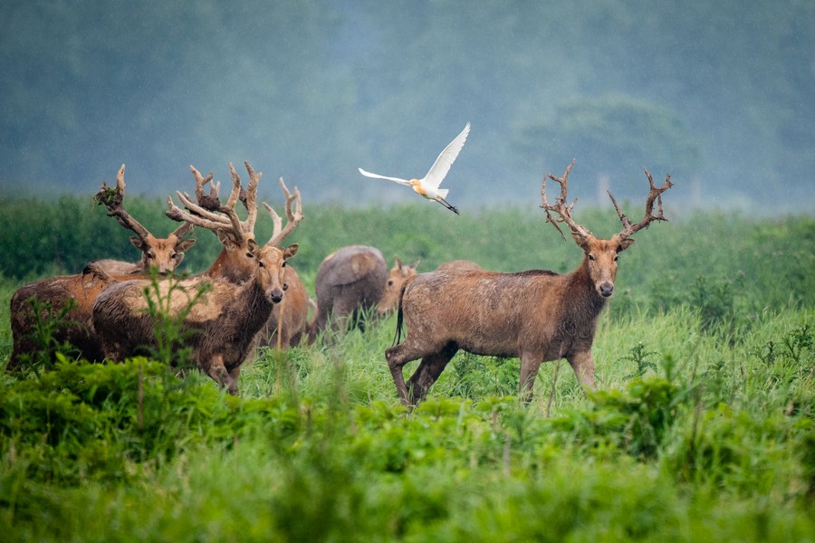 This photo taken on April 28, 2023 shows milu deer at Shishou Milu Deer National Nature Reserve in central China's Hubei Province. (Xinhua/Wu Zhizun)