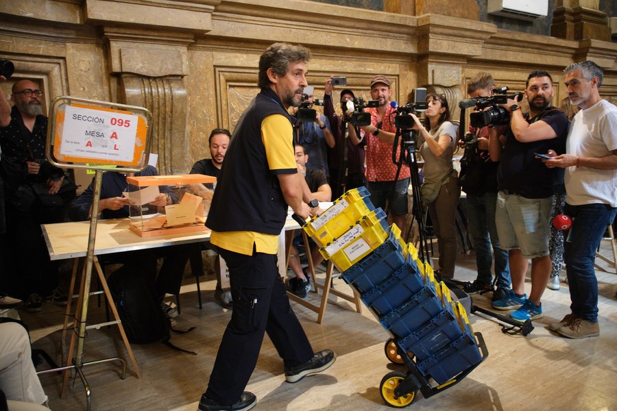 A postman transports postal ballots at a polling station in Madrid, Spain, on July 23, 2023. (Xinhua/Meng Dingbo)