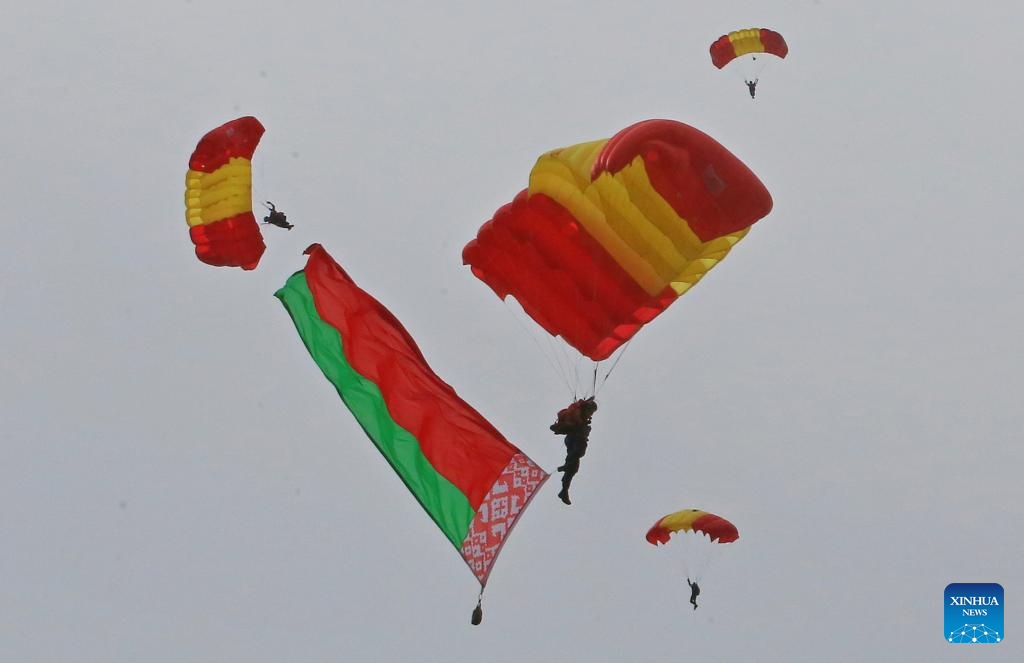 Parachute athletes demonstrate Belarusian national flag to celebrate the 170th anniversary of Belarus' fire service in Minsk, Belarus, July 22, 2023. Festive events dedicated to the 170th anniversary of Belarus' fire service were held in Minsk on Saturday. (Photo by Henadz Zhinkov/Xinhua)