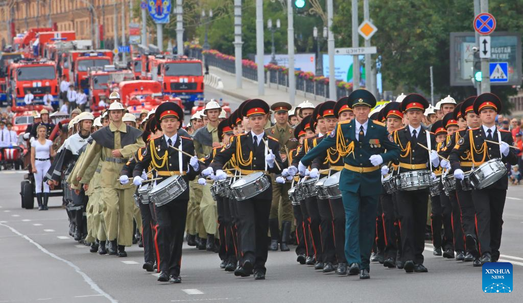 A parade to celebrate the 170th anniversary of Belarus' fire service is seen in Minsk, Belarus, July 22, 2023. Festive events dedicated to the 170th anniversary of Belarus' fire service were held in Minsk on Saturday. (Photo by Henadz Zhinkov/Xinhua)