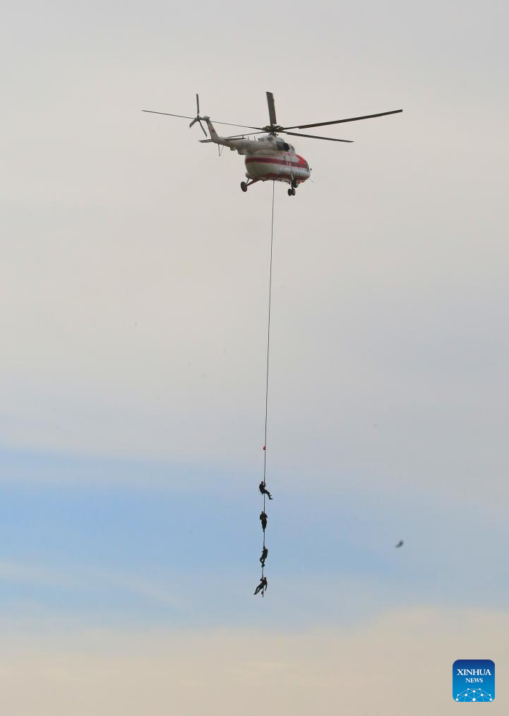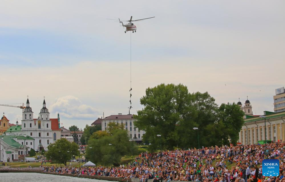 A helicopter simulates rescue operation to celebrate the 170th anniversary of Belarus' fire service in Minsk, Belarus, July 22, 2023. Festive events dedicated to the 170th anniversary of Belarus' fire service were held in Minsk on Saturday. (Photo by Henadz Zhinkov/Xinhua)