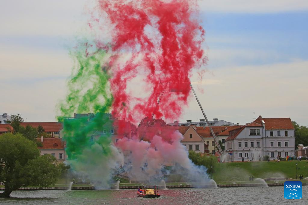 People celebrate the 170th anniversary of Belarus' fire service in Minsk, Belarus, July 22, 2023. Festive events dedicated to the 170th anniversary of Belarus' fire service were held in Minsk on Saturday. (Photo by Henadz Zhinkov/Xinhua)