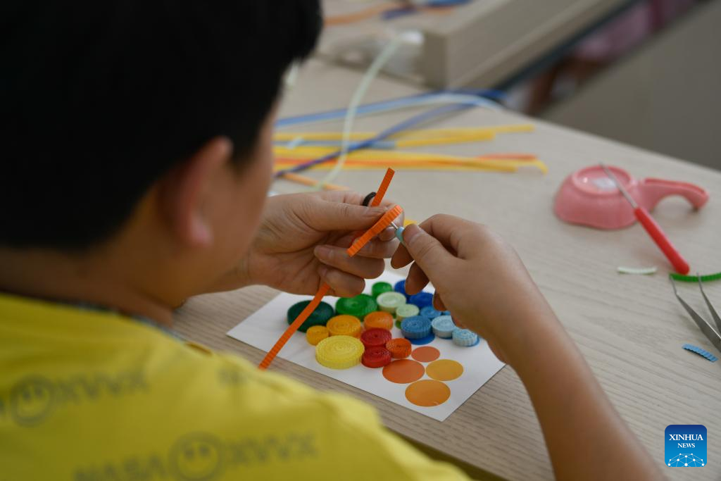 Local residents experience making paper quilling artworks at a cultural and creative workshop in Wenjiang District, Chengdu, southwest China's Sichuan province, July 5, 2023. (Xinhua/Xu Bingjie)