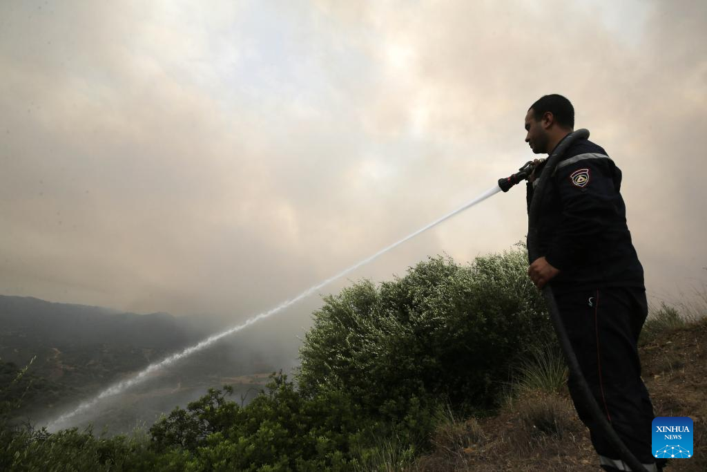 A firefighter battles a wildfire in Bouira Province, Algeria, on July 24, 2023. The death toll from wildfires in northern Algeria has risen to 34, including 10 soldiers, the Interior Ministry said in an update on Monday. (Xinhua)