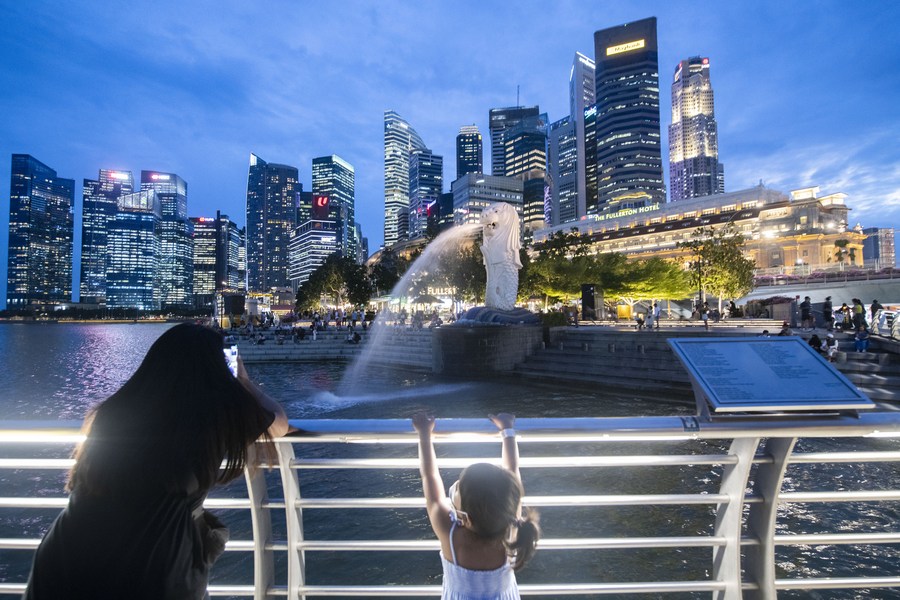 Tourists visit Singapore's tourism icon, the Merlion, on the eve of its 50th birthday at the Merlion Park in Singapore, Sept. 14, 2022. (Photo by Then Chih Wey/Xinhua)