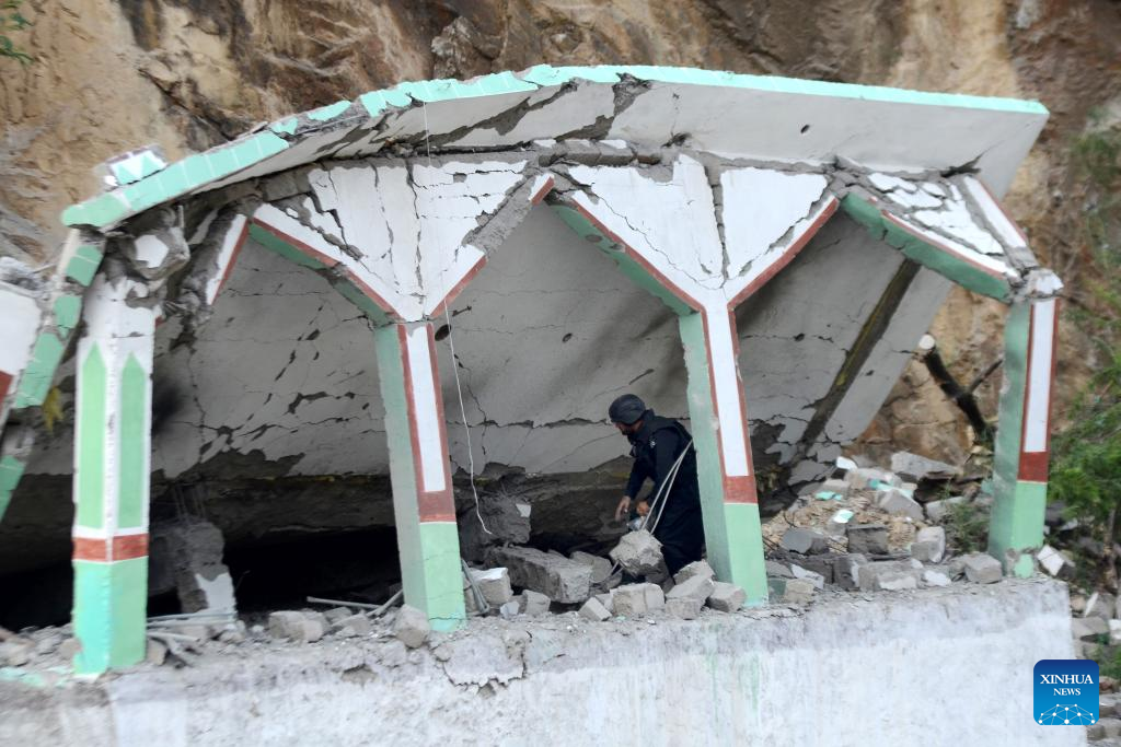 A security member examines the blast site in Khyber district, Khyber Pakhtunkhwa province, Pakistan, on July 25, 2023. A policeman was killed and several others were injured in a suicide blast in Pakistan's northwest Khyber Pakhtunkhwa province on Tuesday, police said. (Str/Xinhua)