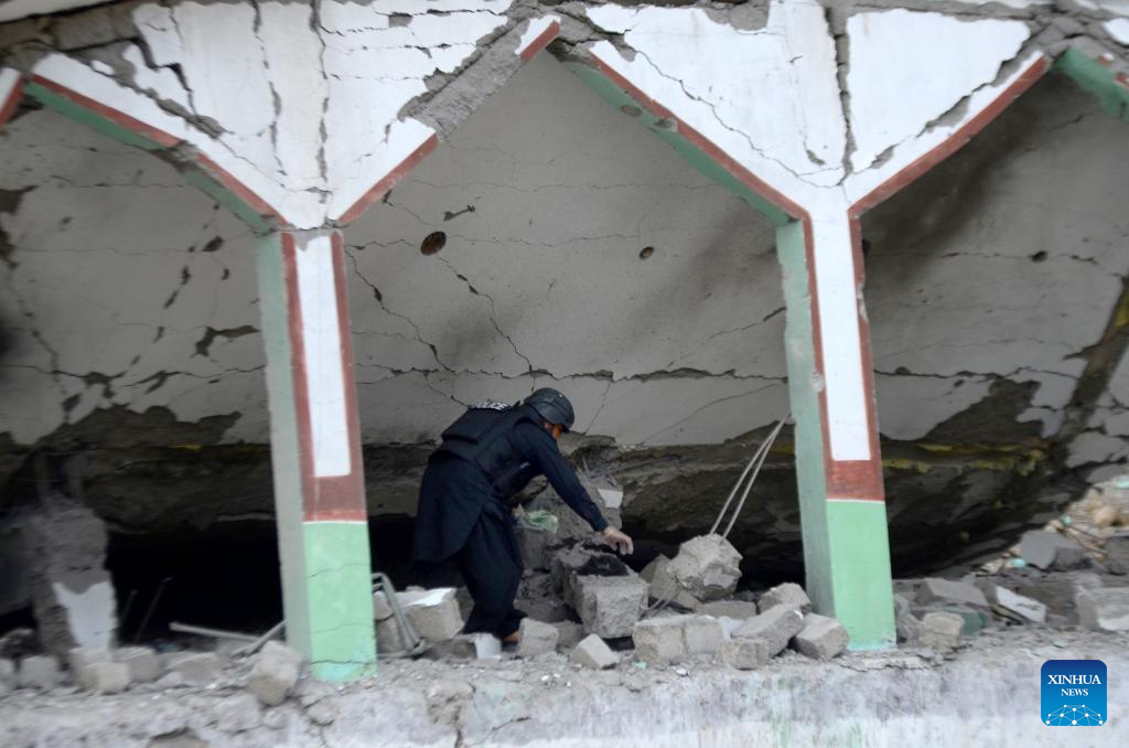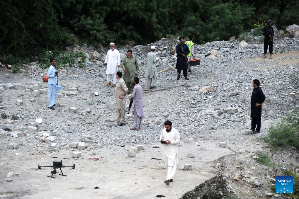 Security personnel examine the blast site in Khyber district, Khyber Pakhtunkhwa province, Pakistan, on July 25, 2023. A policeman was killed and several others were injured in a suicide blast in Pakistan's northwest Khyber Pakhtunkhwa province on Tuesday, police said. (Str/Xinhua)
