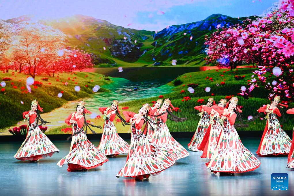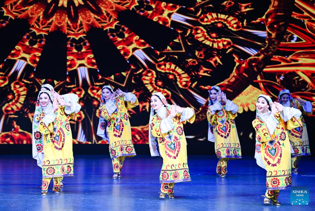 Actresses of the dance troupe "Tumor" from the Uzbekistan National Grand Theatre perform during a gala titled "Our Common Home" at the 6th China Xinjiang International Dance Festival in Urumqi, northwest China's Xinjiang Uygur Autonomous Region, July 24, 2023. (Xinhua/Li Xiang)