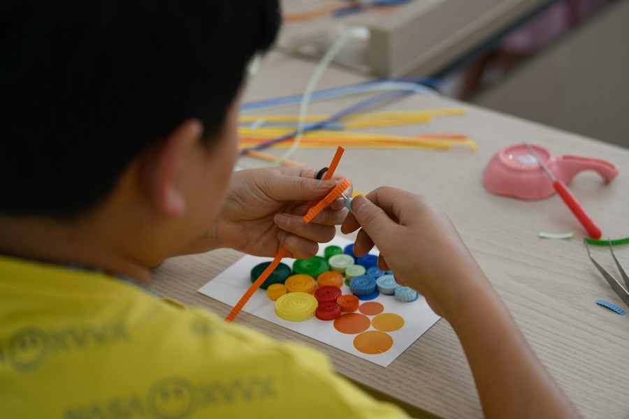Wang Linjiang, the chief craftsman at a cultural and creative workshop, rolls paper strips in Wenjiang District, Chengdu, southwest China's Sichuan province, July 5, 2023. (Xinhua/Xu Bingjie)