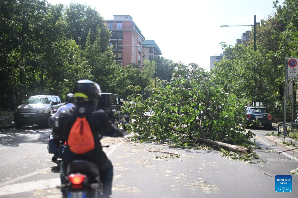 A fallen tree is seen on a road after thunderstorms in Milan, Italy, on July 25, 2023. While the southern two-thirds of Italy struggled under the oppressive heat, most of the northern area was pelted by thunderstorms and over-sized hail. Media reports said the emergency services in Milan had responded to more than 200 requests for help related to flooding, fallen trees, and damage to cars and homes, since a severe storm hit the city late Monday. (Str/Xinhua)