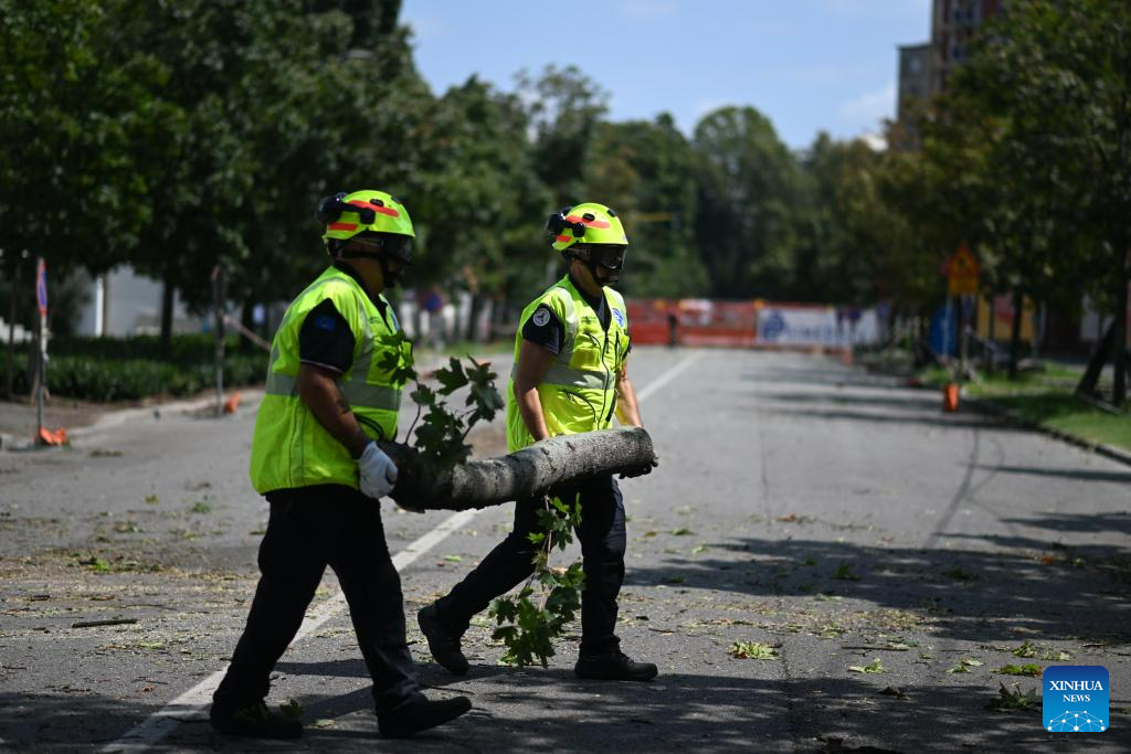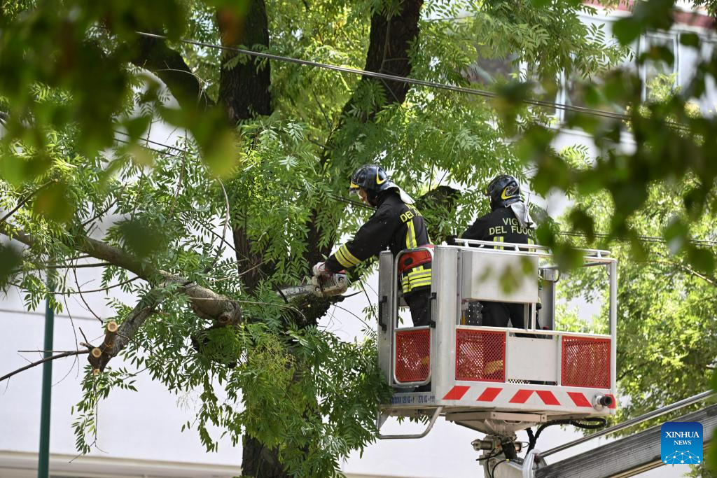 Workers remove a fallen branch after thunderstorms in Milan, Italy, on July 25, 2023. While the southern two-thirds of Italy struggled under the oppressive heat, most of the northern area was pelted by thunderstorms and over-sized hail. Media reports said the emergency services in Milan had responded to more than 200 requests for help related to flooding, fallen trees, and damage to cars and homes, since a severe storm hit the city late Monday. (Str/Xinhua)