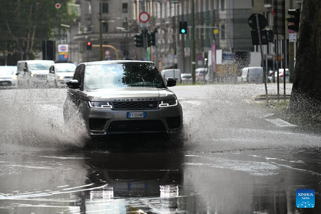 A vehicle drives through a flooded street after thunderstorms in Milan, Italy, on July 25, 2023. While the southern two-thirds of Italy struggled under the oppressive heat, most of the northern area was pelted by thunderstorms and over-sized hail. Media reports said the emergency services in Milan had responded to more than 200 requests for help related to flooding, fallen trees, and damage to cars and homes, since a severe storm hit the city late Monday. (Str/Xinhua)