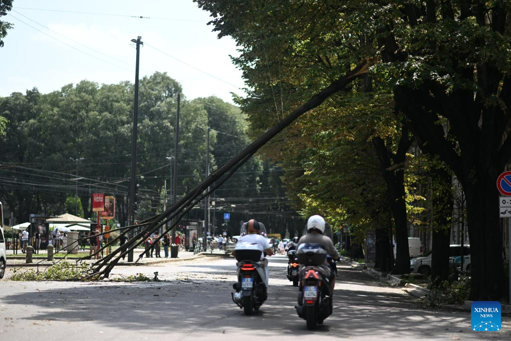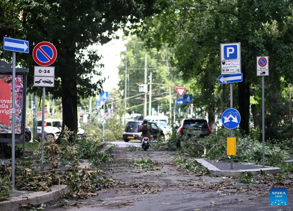 Fallen branches are seen after thunderstorms in Milan, Italy, on July 25, 2023. While the southern two-thirds of Italy struggled under the oppressive heat, most of the northern area was pelted by thunderstorms and over-sized hail. Media reports said the emergency services in Milan had responded to more than 200 requests for help related to flooding, fallen trees, and damage to cars and homes, since a severe storm hit the city late Monday. (Str/Xinhua)