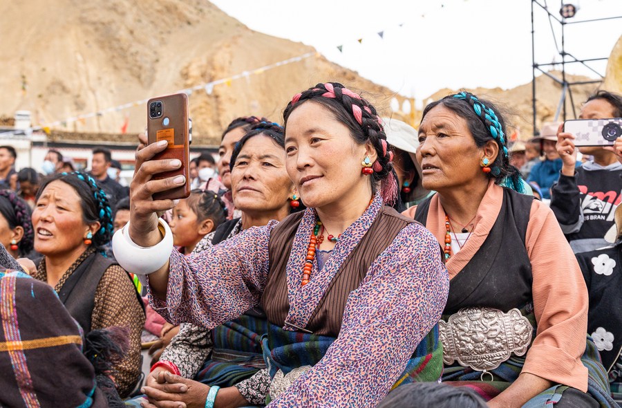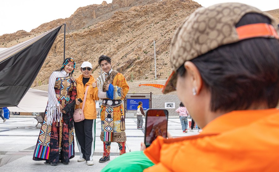 A tourist poses for photos with performers at a music and food festival in Zhaxizom Township, Tingri County, southwest China's Tibet Autonomous Region, July 23, 2023. (Photo by Tenzin Nyida/Xinhua)