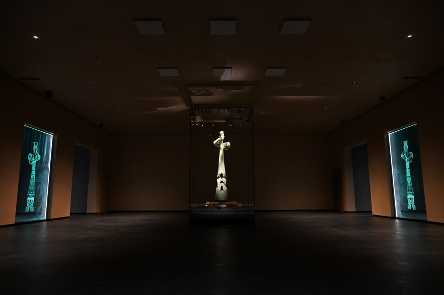 A total of more than 1,500 pieces or sets of relics, including pottery, bronze, jade and gold wares are showcased in the new building, which has an exhibition area of 22,000 square meters. Among the highlights are a nearly 4-meter-high sacred bronze tree, golden masks, and bronze standing figurines, all dating back around 3,000 years. More than 300 relics were newly excavated from the sacrificial pits No. 3 to No. 8.