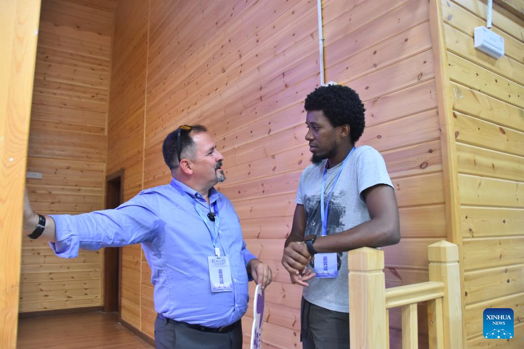 Fernando Munoz Bernal (L) talks with a student in Karamay, northwest China's Xinjiang Uygur Autonomous Region, July 20, 2023. (Xinhua/Gu Yu)