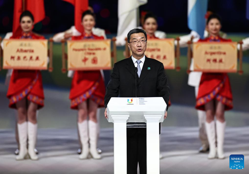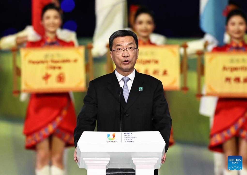 Huai Jinpeng, president of the Organizing Committee of the Chengdu Universiade, delivers a speech during the opening ceremony of the 31st FISU Summer World University Games in Chengdu, southwest China's Sichuan Province, July 28, 2023. (Xinhua/Yang Qing)