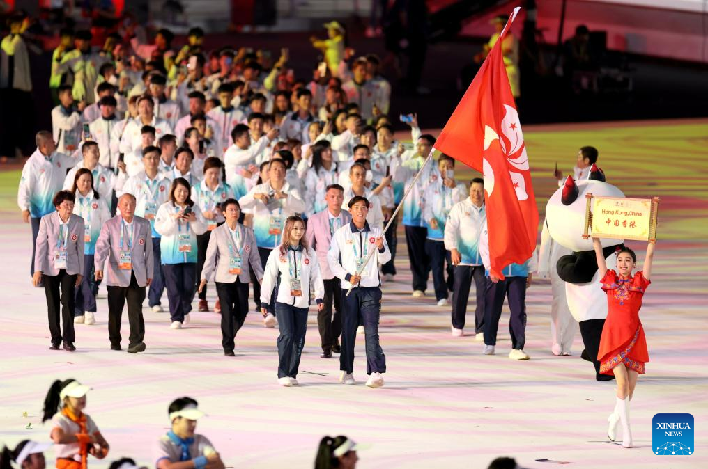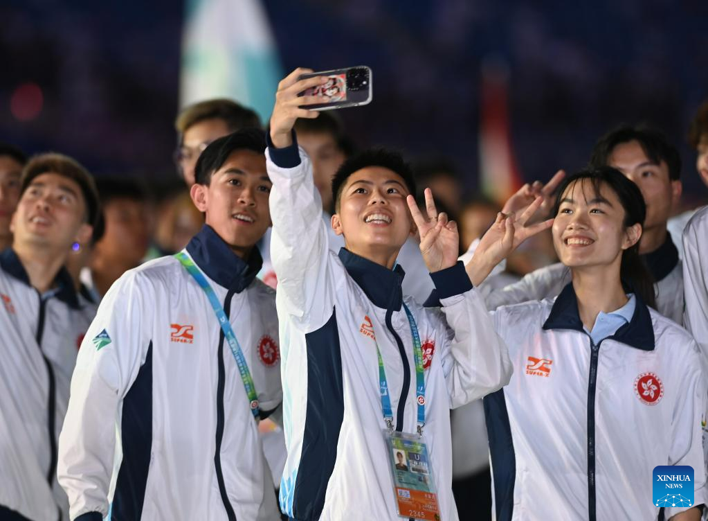 Members of the delegation of China's Hong Kong march during the opening ceremony of the 31st FISU Summer World University Games in Chengdu, southwest China's Sichuan Province, July 28, 2023. (Xinhua/Jia Haocheng)