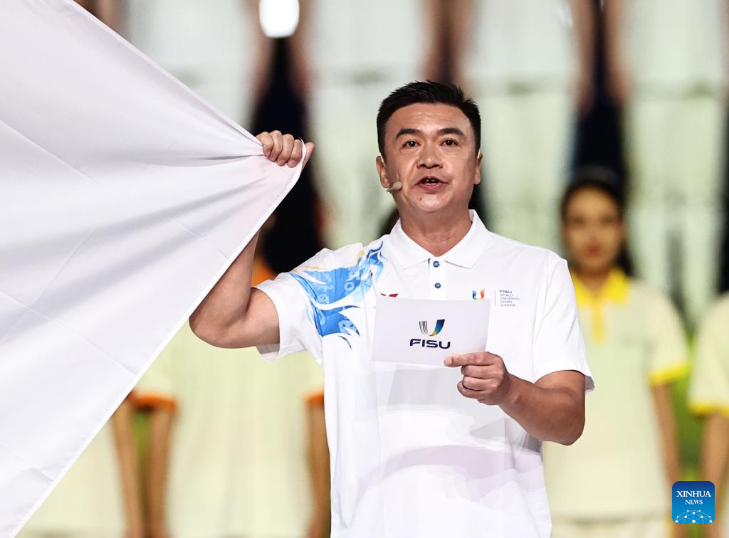 Liu Jiang takes an oath on behalf of all judges during the opening ceremony of the 31st FISU Summer World University Games in Chengdu, southwest China's Sichuan Province, July 28, 2023. (Xinhua/Yang Qing)