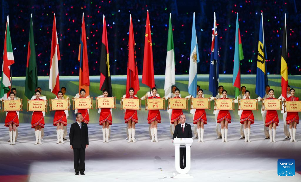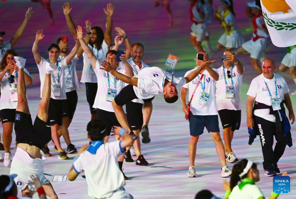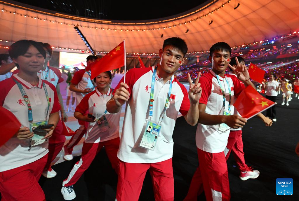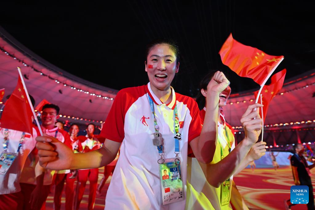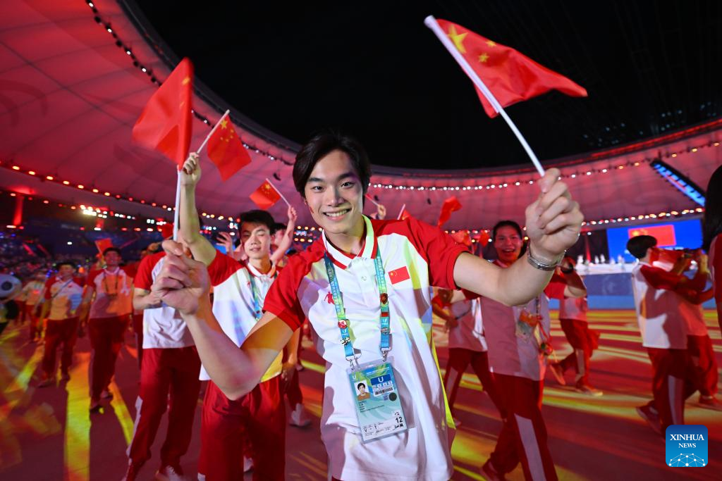 Members of China's delegation march during the opening ceremony of the 31st FISU Summer World University Games in Chengdu, southwest China's Sichuan Province, July 28, 2023. (Xinhua/Jia Haocheng)