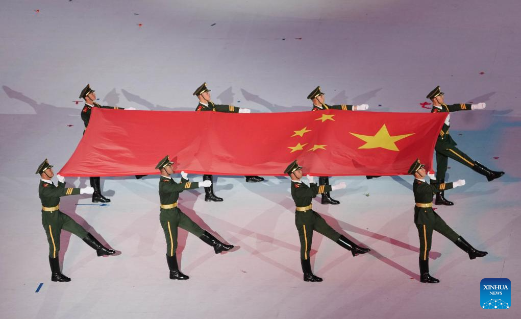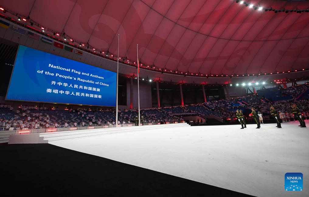 Chinese national flag is raised during the opening ceremony of the 31st FISU Summer World University Games in Chengdu, southwest China's Sichuan Province, July 28, 2023. (Xinhua/Wu Gang)