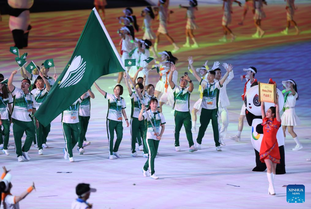 Members of the delegation of China's Macao march during the opening ceremony of the 31st FISU Summer World University Games in Chengdu, southwest China's Sichuan Province, July 28, 2023. (Xinhua/Zhang Liyun)