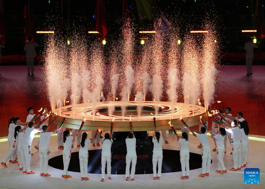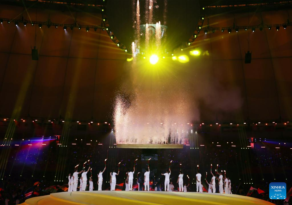 Cauldron is lit during the opening ceremony of the 31st FISU Summer World University Games in Chengdu, southwest China's Sichuan Province, July 28, 2023. (Xinhua/Yang Qing)