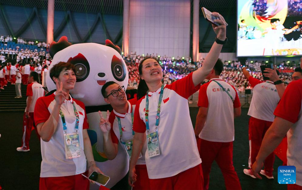 Members of China's delegation pose for photos during the opening ceremony of the 31st FISU Summer World University Games in Chengdu, southwest China's Sichuan Province, July 28, 2023. (Xinhua/Xu Bingjie)