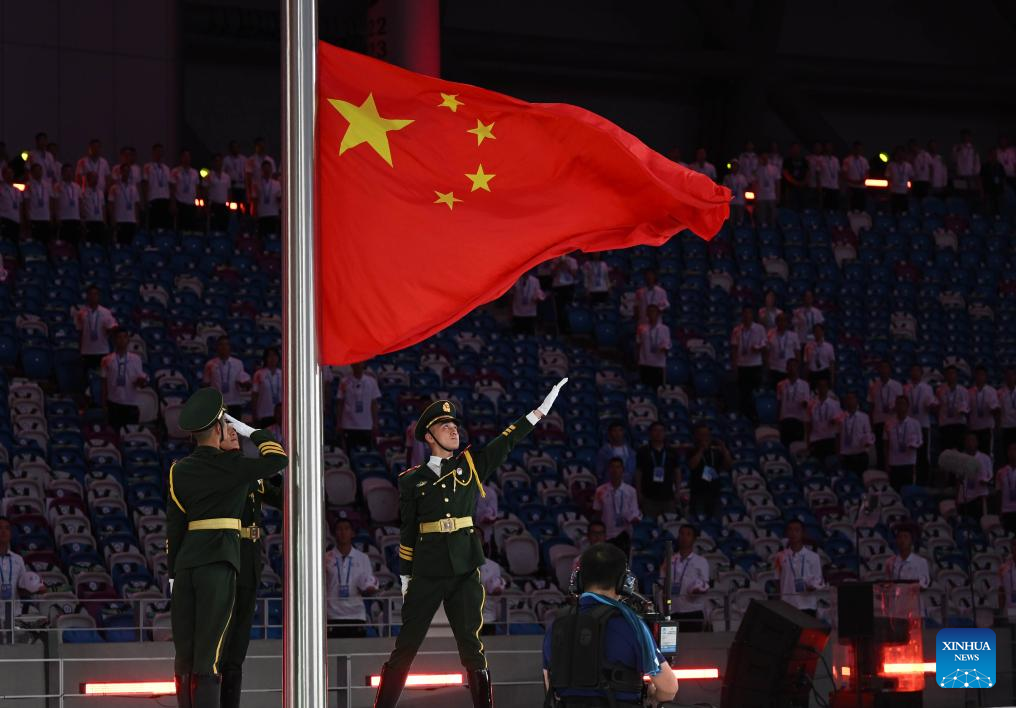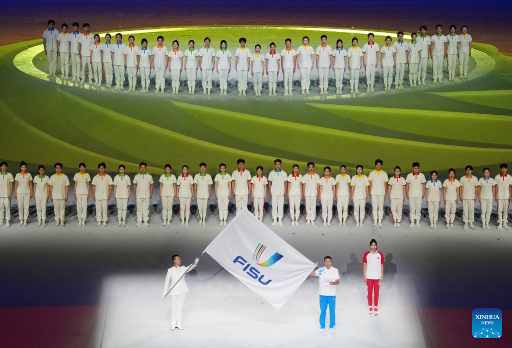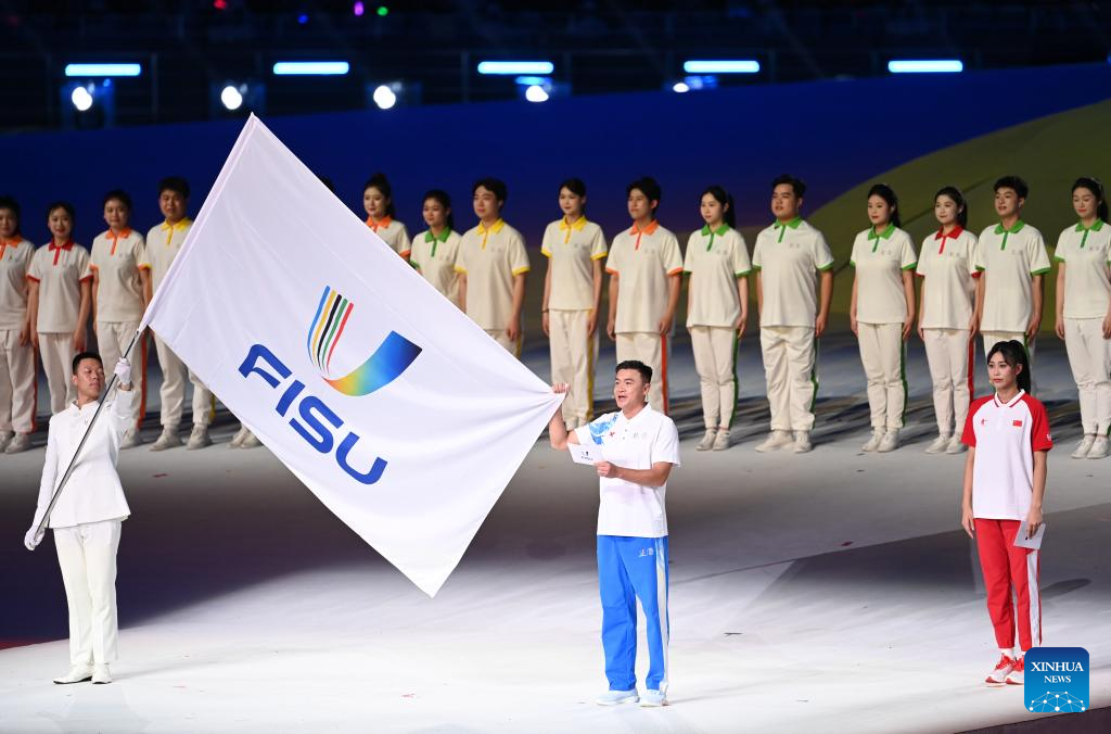 The Chinese national flag is raised during the opening ceremony of the 31st FISU Summer World University Games in Chengdu, southwest China's Sichuan Province, July 28, 2023. (Xinhua/Wang Xi)